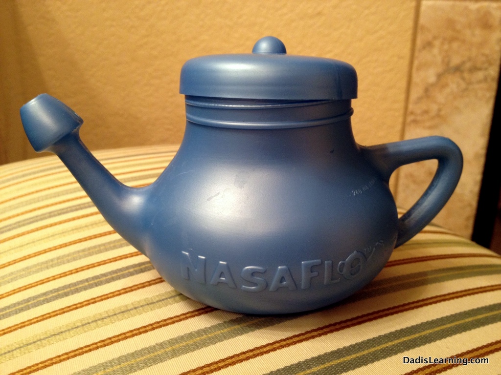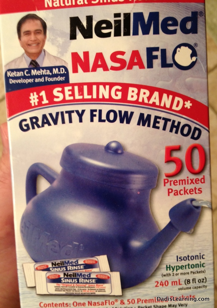 Here’s how it works. In the little pot you mix up some of the sinus cleansing solution with bottled water. Don’t use tap water since it can have chlorine and other things that might actually inflame your sinuses. Lean over the sink. Tilt your head to one side and place the spout of the Nasa Flo into your nostril. Prepare yourself! The water will go up your nose and into your sinuses and out the other side. And with it goes all sorts of horrible stuff like mucus and allergens.