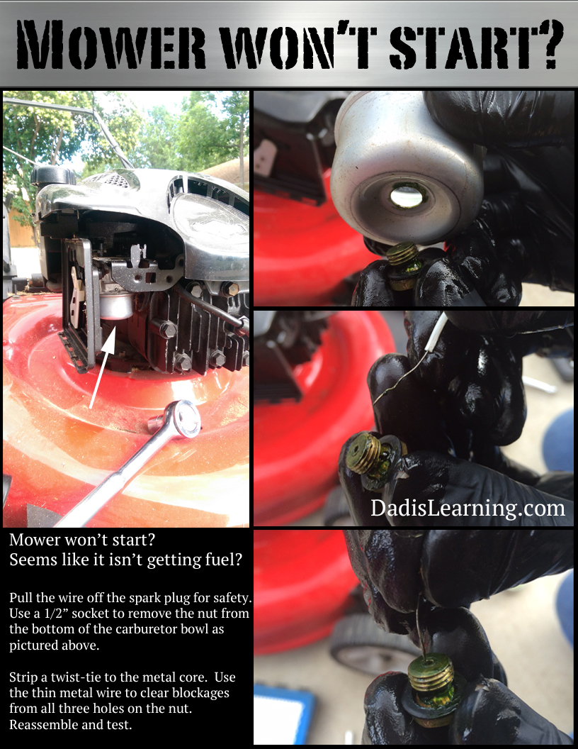 Knowing someone who truly knows what they are doing is also amazingly helpful in saving time and money. I recently wrote about the trick that I found out for fixing the fuel issue I had with several of our mowers. If I hadn’t known where to go to ask about it I could have dropped a small fortune in engine repair or even mower replacement. (The pic to the right is a simple graphic of how to clog a blocked main jet on side-mounted carburetor Briggs and Stratton engines. Click for a full-page version.)