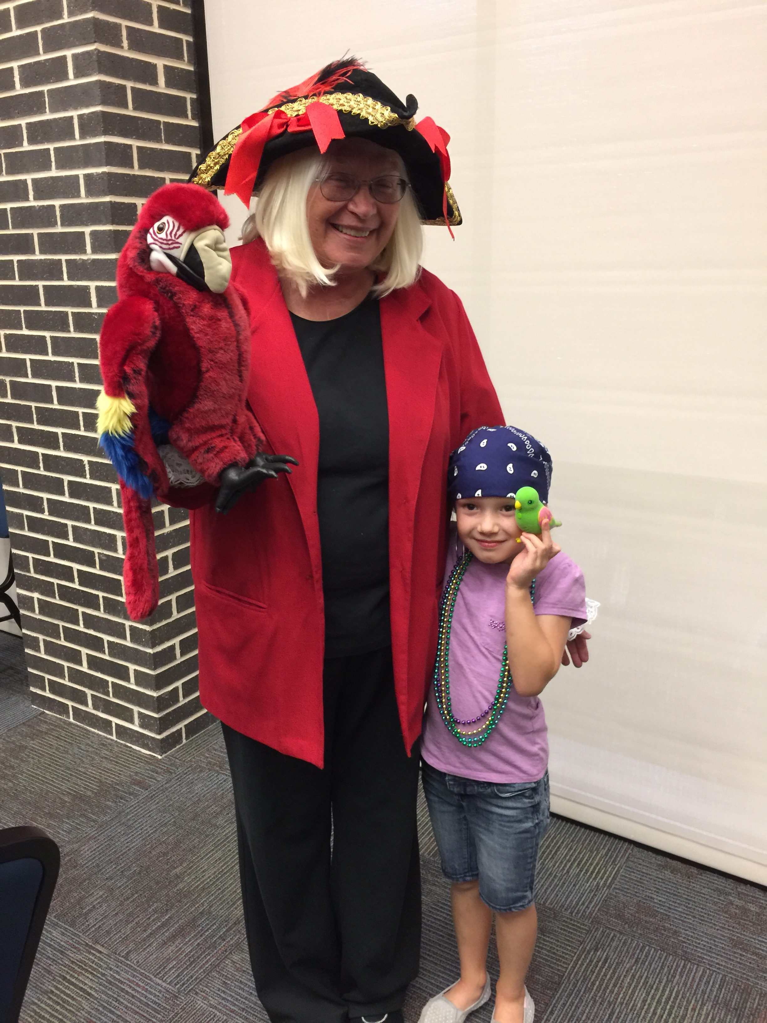 Our youngest daughter with her school librarian at a costume themed reading night for families at the local library.